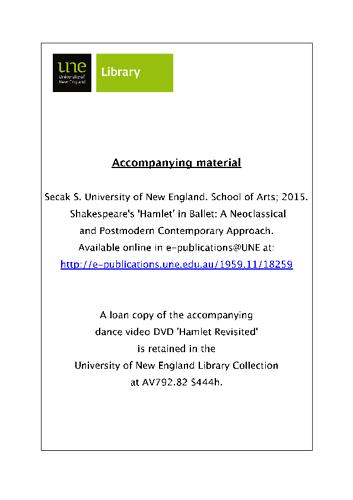 This exegesis is an integral part of my PhD in Creative Practice project and is complementary to the dance video titled 'Hamlet Revisited'. It shows the transformation of a video recording of my own choreography of the ballet 'Hamlet' into a contemporary post-postmodern dance video DVD 'Hamlet Revisited', answering the research question: How to transform an archival recording of a neoclassical ballet performance into a new artistic dance video by implementing postmodern philosophical concepts? The goal of the project is to elucidate the transformation of 'Hamlet' to 'Hamlet Revisited' presenting both the neoclassical choreographic approach and the recent postmodern approach that traverses into a transmodern dance video of an eclectic blend of styles and techniques.